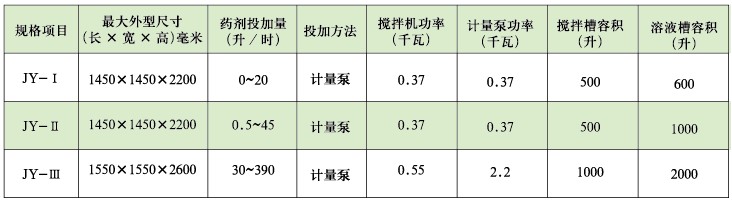 JY加藥裝置三種型號,都有三大部分組成:1、攪拌機 2、溶液槽 3、計量裝置及投加設(shè)備。
